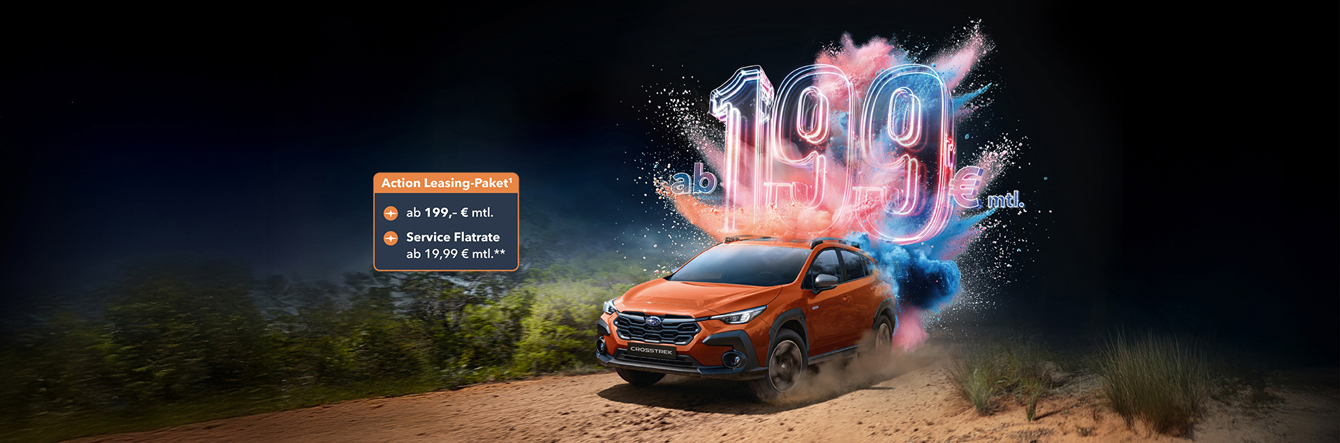 1 Die Aktion gilt vom 01.10.2025 bis 31.12.2025 in Verbindung mit dem Leasing eines aktuellen Subaru Crosstrek (Modelljahr 2024) (Neu- oder Vorführwagen), Zulassung/Besitzumschreibung bis 31.12.2025 bei teilnehmenden Subaru Partnern. Die Aktion wird von der SUBARU Deutschland GmbH getragen und ist nicht mit anderen Aktionen der SUBARU Deutschland GmbH kombinierbar mit Ausnahme des Aktionsangebots zur Service-Flatrate. Weitere Detailinformationen erhalten Sie bei Ihrem teilnehmenden Subaru Partner oder unter www.subaru.de. Subaru Crosstrek MJ24 Trend Leasingbeispiel (gültig bis 31.12.2025): Anzahlung 0,00 EUR, monatliche Rate 199 EUR, Laufzeit 24 Monate, Laufleistung p. a. 5000 km, zzgl. Überführungskosten 1690 EUR, Gesamtpreis (inkl. Überführungskosten) 6466 EUR, Freibleibendes Leasingangebot der SUBARU Finance, Ein Service der MCE Bank GmbH, Schieferstein 9, 65439 Flörsheim. Alle Preise verstehen sich inkl. Umsatzsteuer.